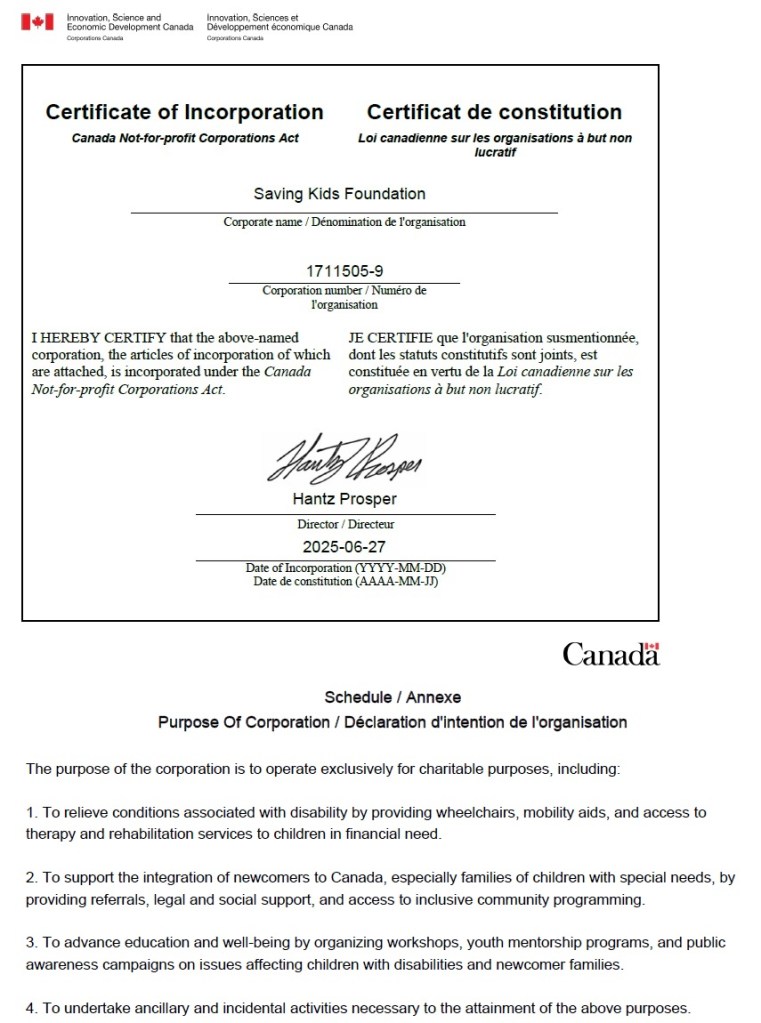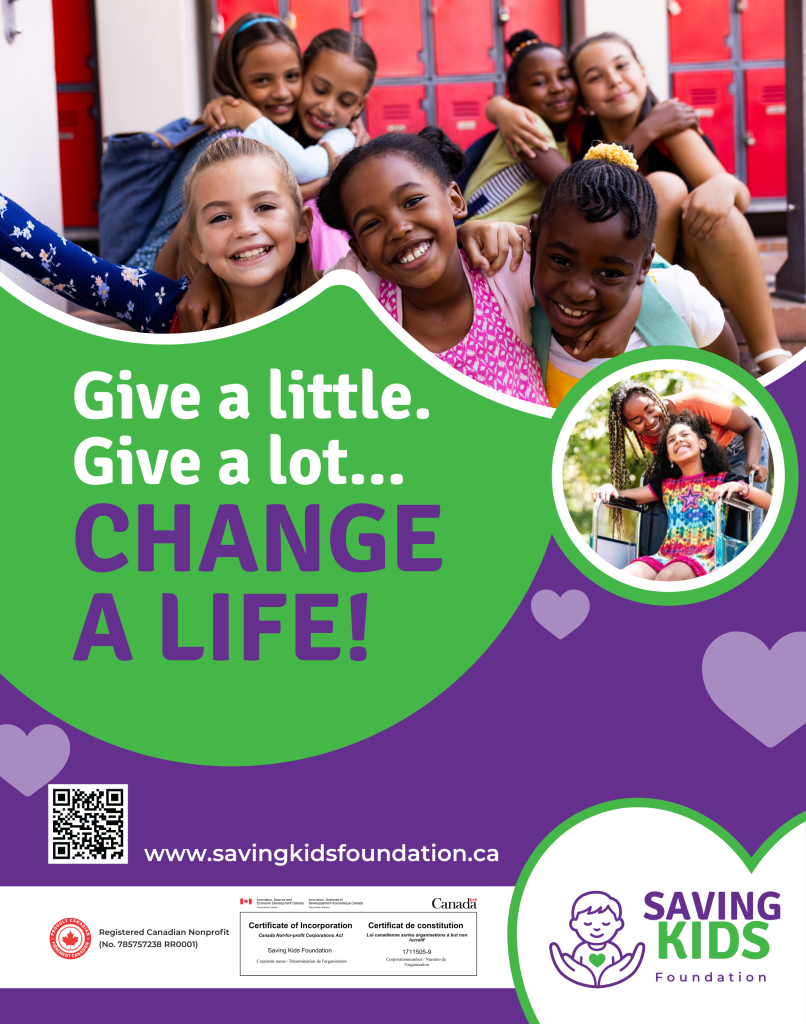 Saving Kids Foundation is a Registered Canadian Non-for-Profit (Registration No. 785757238 RR0001) committed to transforming the lives of children living with mobility challenges and families affected by socio-economic hardship.